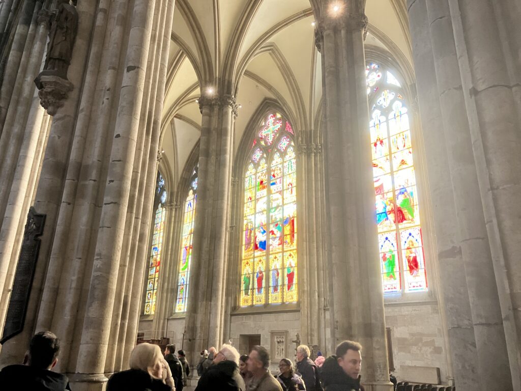 実はこれ、第二次世界大戦で破壊された窓を修復する際、2007年に新しく設置されたものなんです。約1万1500個もの色の付いたガラスがランダムに配置されていて、光が差し込むと床がまるでデジタルピクセルの海のように輝きます。「中世の厳かな空間にドット絵?!」と最初は驚きますが、この新旧のコントラストがケルンの懐の深さを物語っているんですよね。
