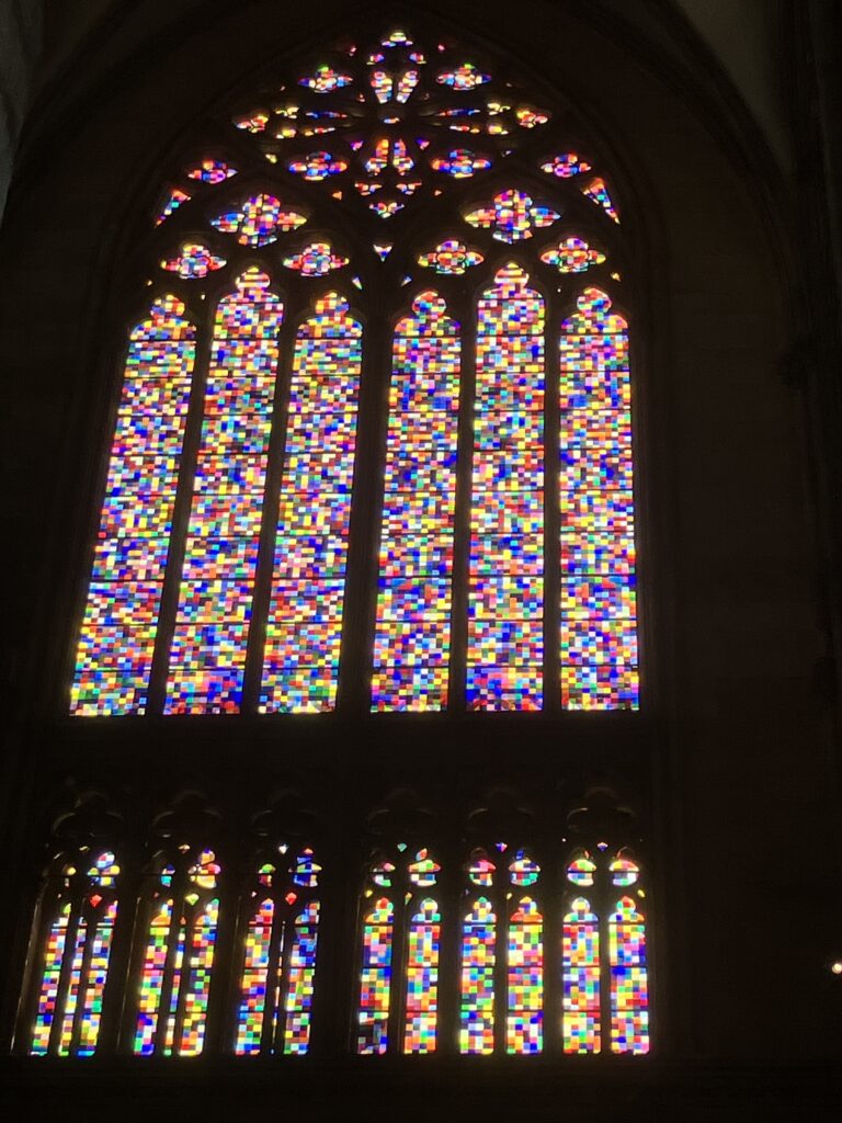 大聖堂内には、聖書の物語を描いた伝統的なステンドグラスが並んでいますが、一つだけ異彩を放つものがあります。それが、現代美術家ゲルハルト・リヒターが手掛けた「リヒター・ウィンドウ」(写真に撮った、あのカラフルな四角いドットのやつです)。昔のテレビって近くで見るとこんなんだったよなーとニヤニヤしながら見てました笑