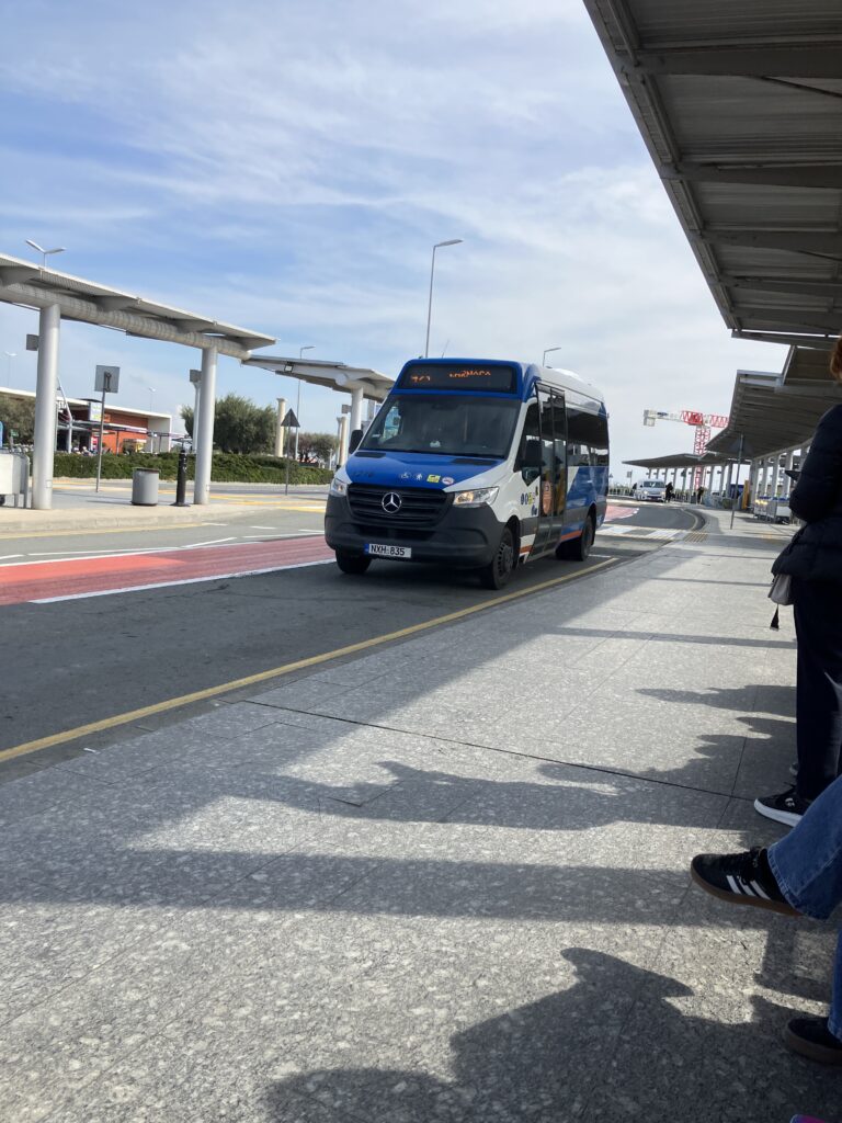 ラルナカ国際空港(Larnaca International Airport / LCA)に到着したら、まずは市街地へのアクセス。タクシーは便利ですが高め。そこで使ったのが路線バス!小さめのメルセデス製バスが空港前に到着します!