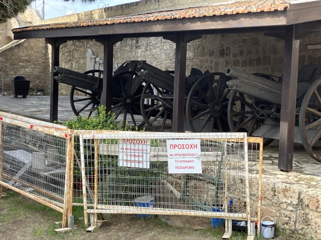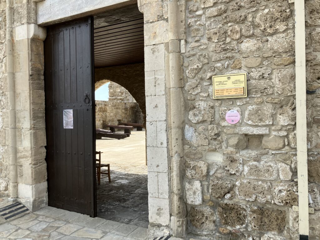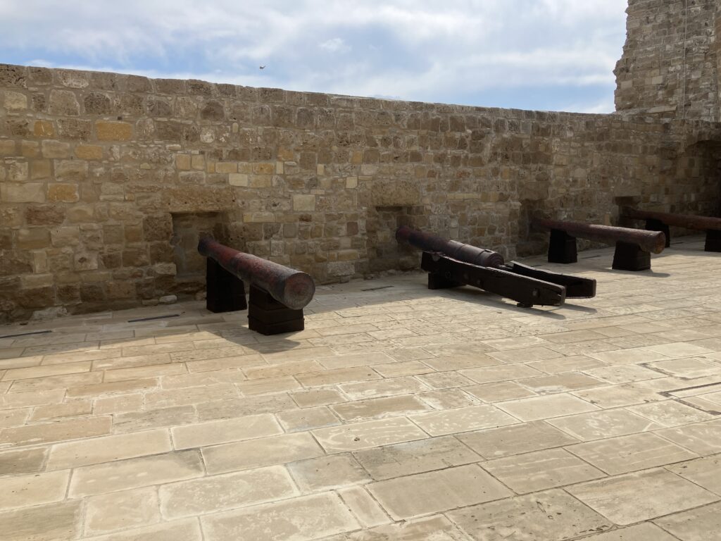 市街地の海沿いに佇むラルナカ城。「城」と聞いて壮大なものを想像すると少し拍子抜けするかも…正直に言うと「小さな砦」という感じ。でもそれがまたいい!コンパクトながら中世の雰囲気がしっかり残っていて、大砲や火器のコレクション、14〜15世紀の陶器展示など見どころ満載です。屋上からの眺めも最高。