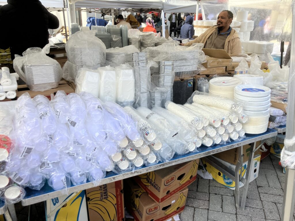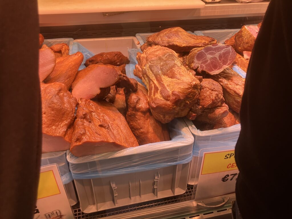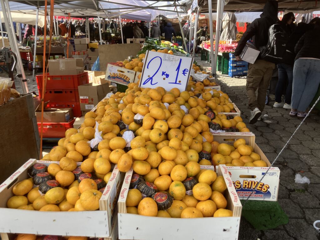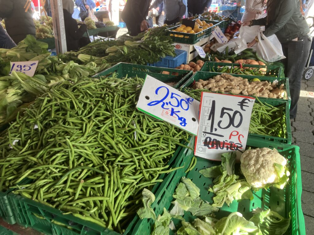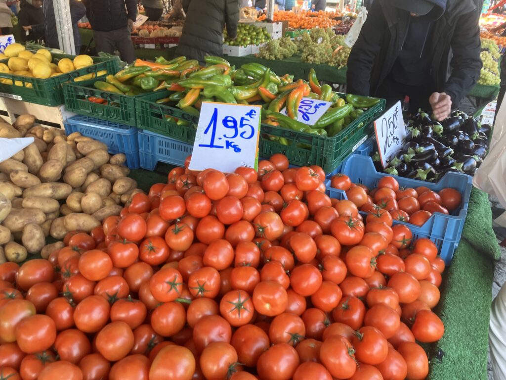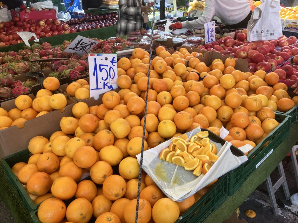 食料品も豊富で、野菜果物が山積みになっている様子は、まるでヨーロッパの別の国に来たかのような雰囲気を味わえます。オレンジトマトはスーパーで買うより安く感じ、スイカもかなり大きなサイズが並んでいました。