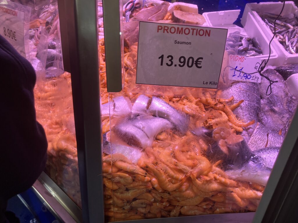 PROMOTION」と表示されているのは、その日の特売品で、スーパーでもよく見かける光景ですが、特にえびが飛ぶように売れていました。
