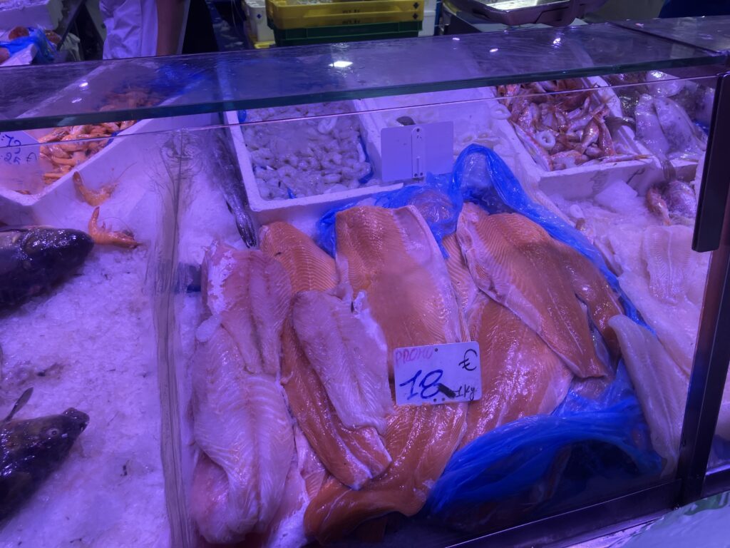 庶民的な魚やサーモン、貝類も多種多様に揃っており、巨大な海老は生きたまま販売されています。