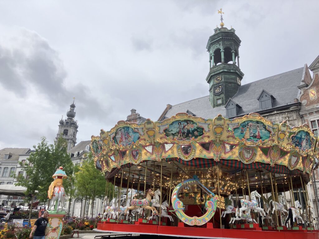 「え?グランプラスってブリュッセルのあの有名な広場じゃないの?」と思うかもしれませんが、モンスにも同名の広場があり、こちらは静かで落ち着いた雰囲気。観光客も少なく写真も心ゆくまでゆったり撮れました。Googleで出回っている写真と同じアングルで撮ろうとしたら移動式遊園地で残念..