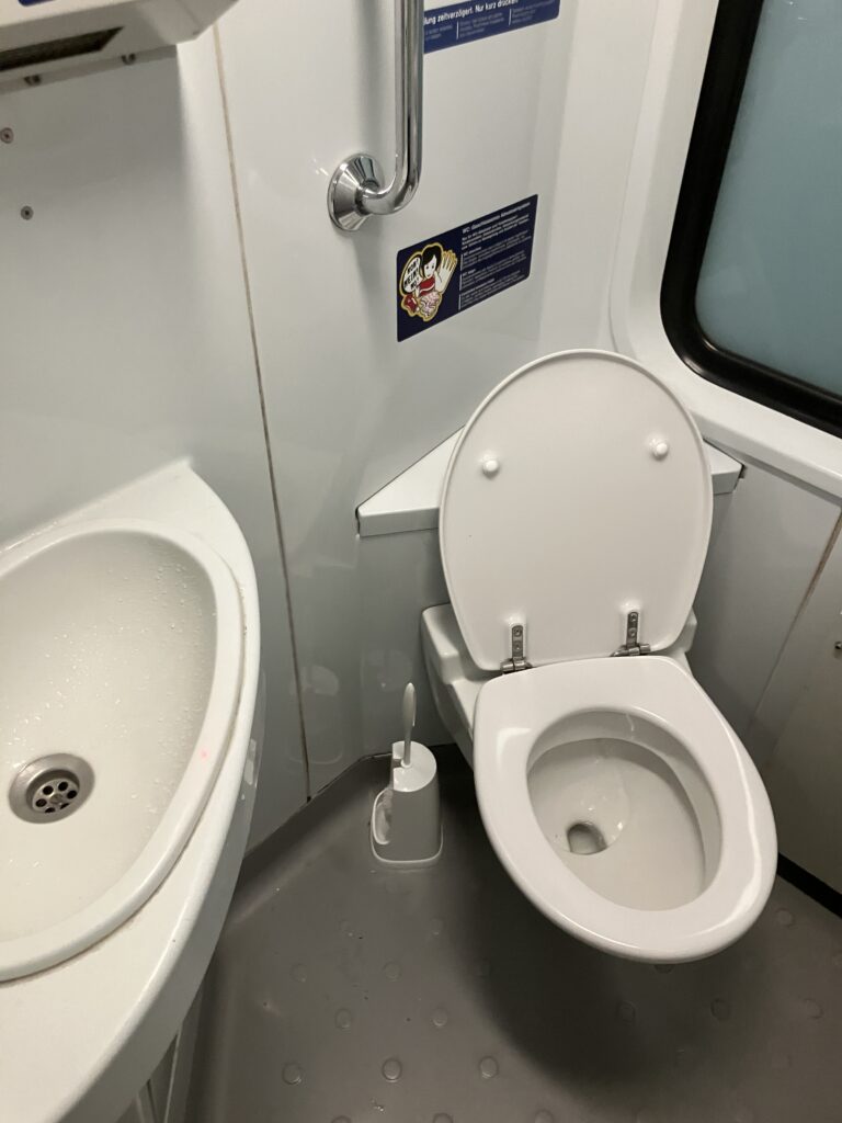 「寝る前にシャワーでさっぱりして、パジャマに着替えて……」なんて妄想は、乗車3分で捨て去りました。 この車両にあるのは、「最低限のトイレ」と、ボタンを押している間だけ水がチョロチョロと出る「極小の洗面台」のみ。