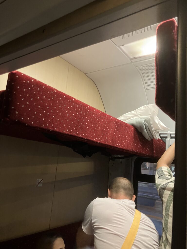 この背もたれも変形して2段目となります。写真では見えづらいですが3段目はすでに上にあります。左右の壁に3段ずつ、計6つのベッドがそびえ立つ室内。通路の幅は、人間が横歩きでやっと通れるレベルです。日本の「サンライズ」の開放的なノビノビ座席を想像していた私にとって、それはもはや「縦に積み上げられた棚」でした。