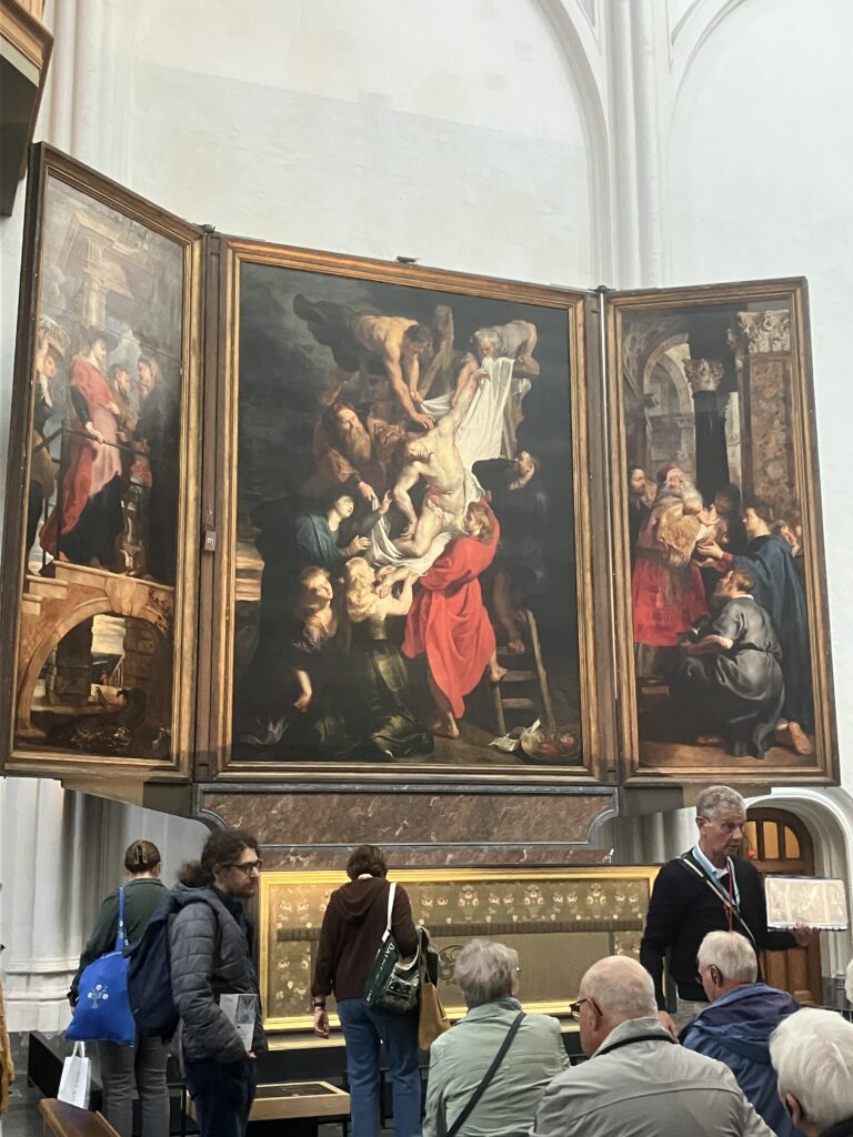 土曜日に訪れたこともあり、館内は多くの観光客で賑わっていました。中に入ると天井の高さにまず圧倒され、ステンドグラスの美しさが空間を一層神秘的に演出しています。そしてやはり見どころは、ネロが憧れたあのルーベンスの大作。実際に見ると、アニメで描かれた場面が鮮明に思い出され、胸が熱くなりました。