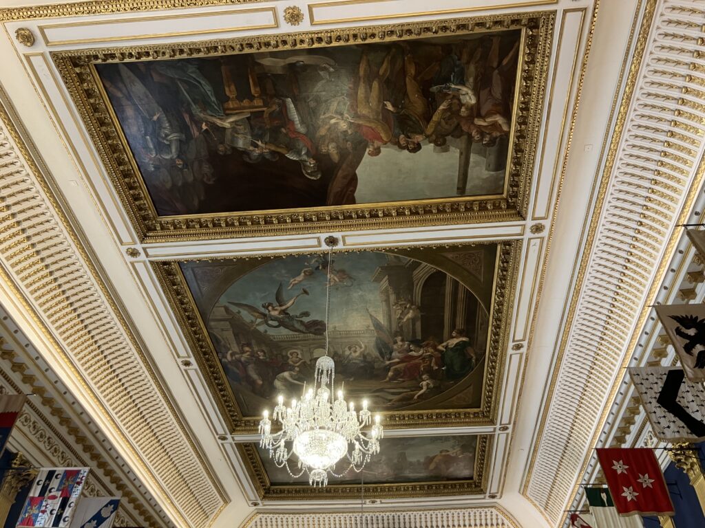 色々な旗や天井には絵画、こんなところに暮らしてみたい!いや、そんなことはない、多分落ち着かない笑
