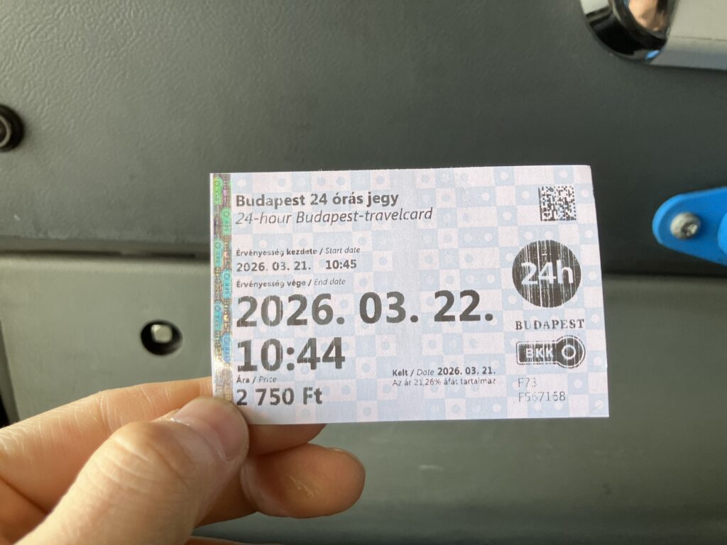 そして普通のバスと地下鉄を乗り継ぎ。価格は約2750フォリント🇭🇺(約1,300円 🇯🇵※購入時)ほど。これ一枚で、100E番を除くバスを含む市内の地下鉄、トラム、バスが24時間乗り放題になります!こういうのありがたい✨ このチケットを見てもらうとわかるように10時44分から24時間有効です!