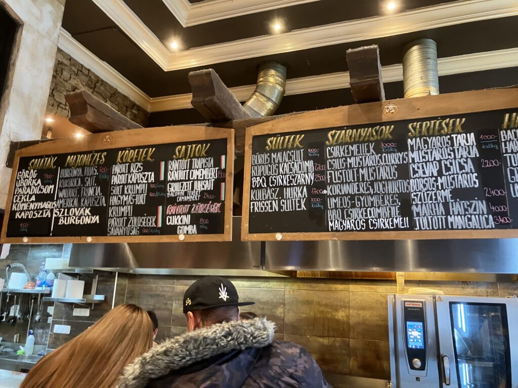 市内(ペスト側)に到着し、お腹も空いたので早速お昼ご飯へ。豪華なレストランではなく、地元の人が利用するような立ち食いの軽食屋(BELVAROSI DISZNOTOROS)に入ってみました。綴り間違っているかも…