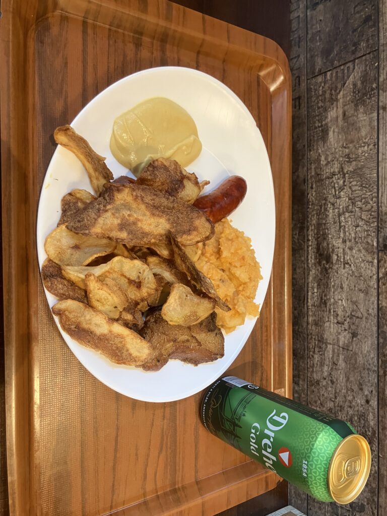 巨大なソーセージ(Kolbász)と、厚切りの豚肉(Sertésfátyol)のソテー、そして大量のフライドチップス(Sült burgonya)。マスタードは僕がかけたのではありません笑