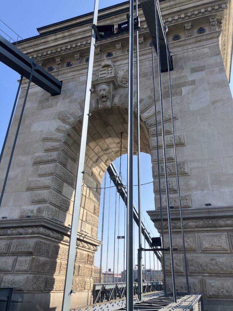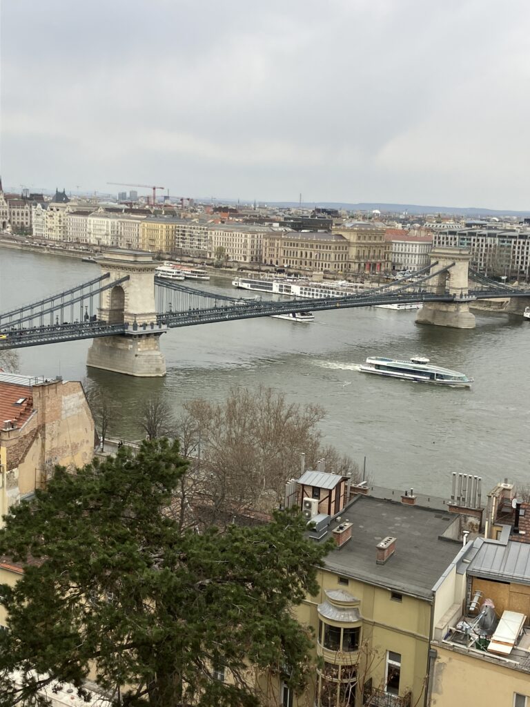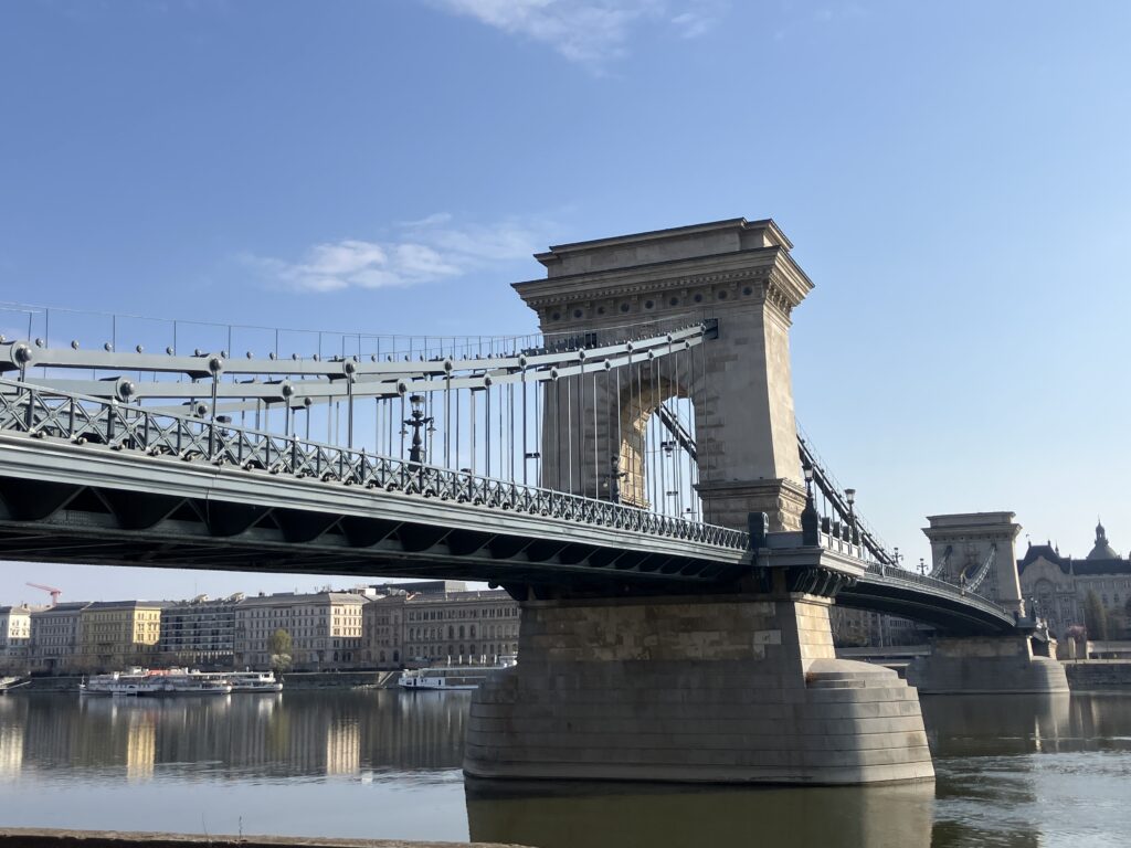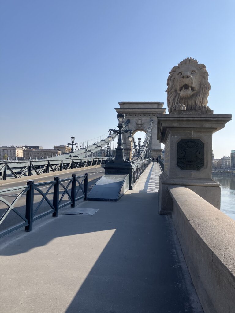 翌朝、夜景のリベンジを果たせぬまま、帰りの飛行機の時間が近づいてきました。 最後に、ブダペストで最も有名な橋、セーチェーニ鎖橋 (Széchenyi Chain Bridge)を歩いて渡りました。