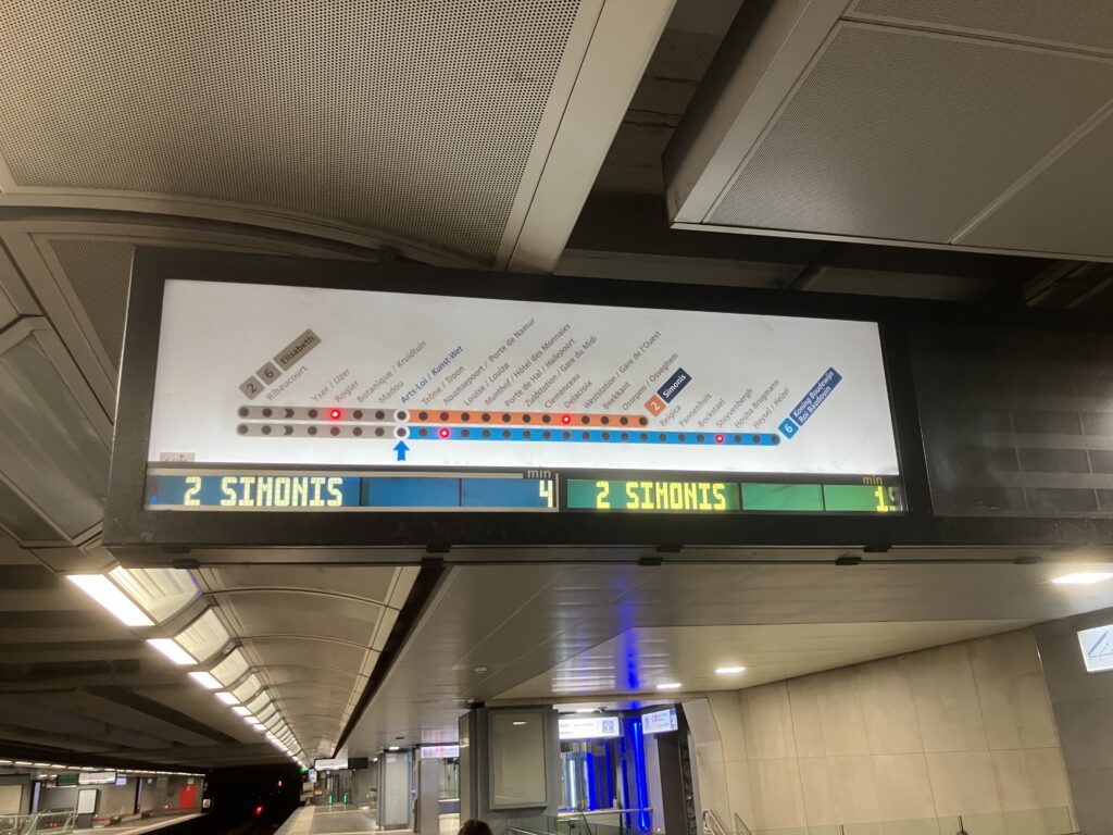 ブリュッセルのメトロに実際に乗ってみると、駅の電子掲示板で次の列車の行き先と到着までの時間がリアルタイムで確認できるようになっているため、待ち時間も把握しやすく便利です!