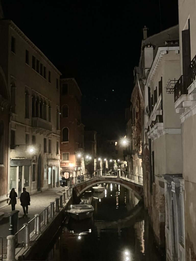 夜になると、街はさらに幻想的になります。街灯に照らされた細い路地は、まさにRPGの世界。 地図を見ても絶対に迷子になるのですが、ヴェネチアでは「迷子になること」自体が最高の観光だと言われる意味がよくわかりました。